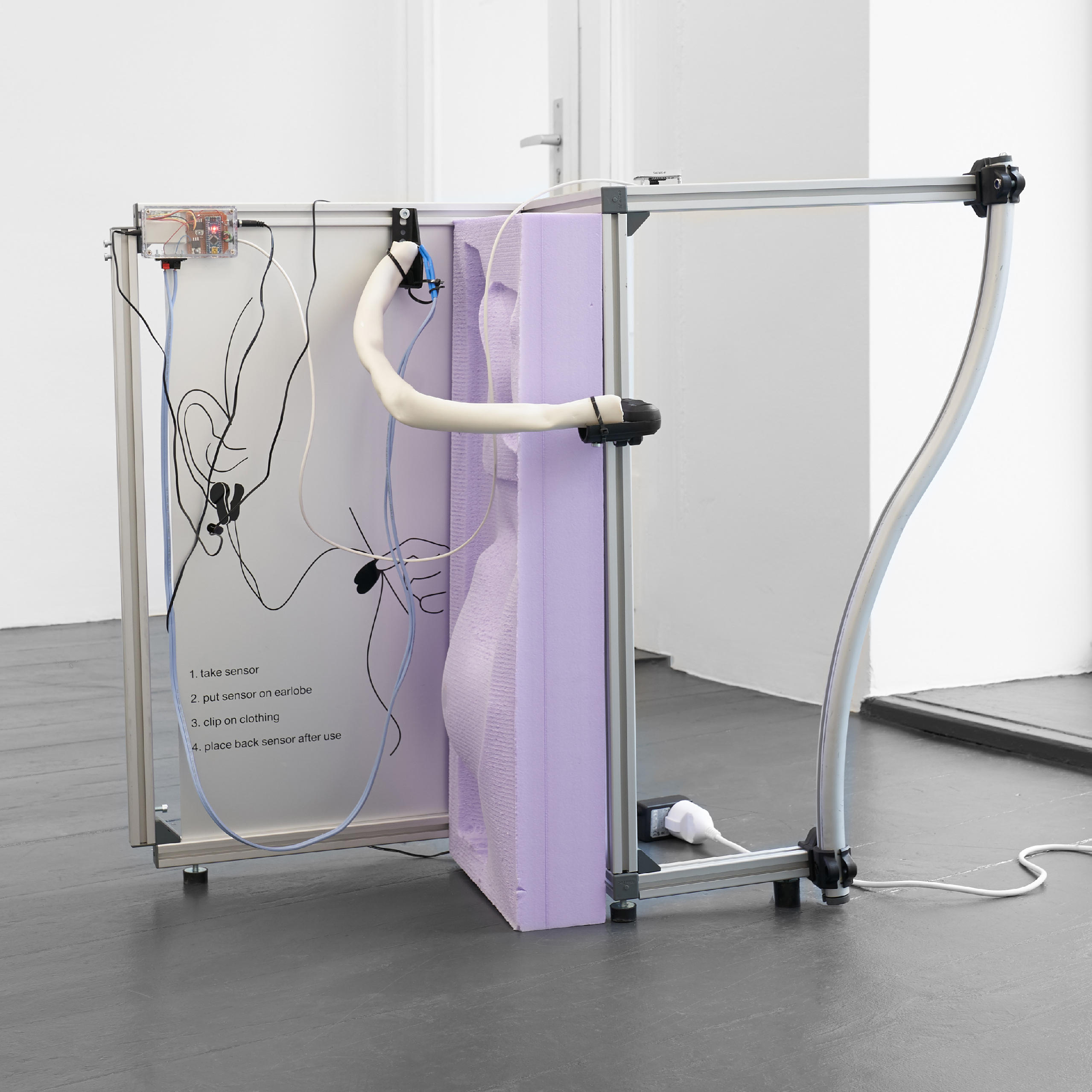 This interactive installation examines our urge to exert control over our body, the uncontrollable nature of the conditions that influence how we feel, and the data systems that analyze our state of wellbeing. Visitors are invited to take a seat and place a sensor on their earlobe. Their heart rate variability (HRV), the period between heartbeats, will immediately become audible as the sound of ticking metal friction on ceramics, and squeaking polysterene. Changes in HRV directly impact on the sound composition by Sjoerd Leijten and vice versa.